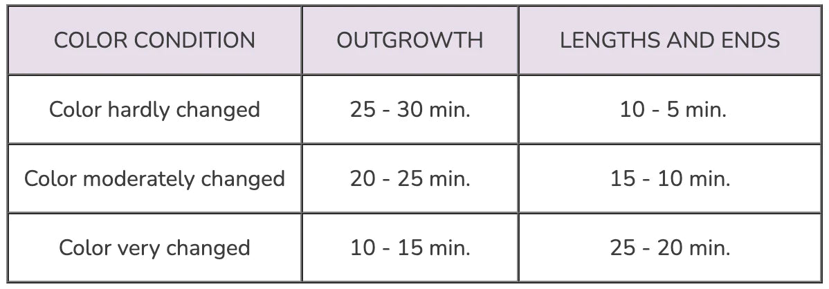 Outgrowth retouch and maintenance: Application depends on the color of lengths and ends. Root processing always totals 35 minutes.