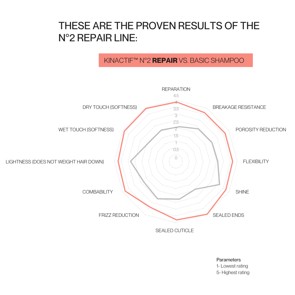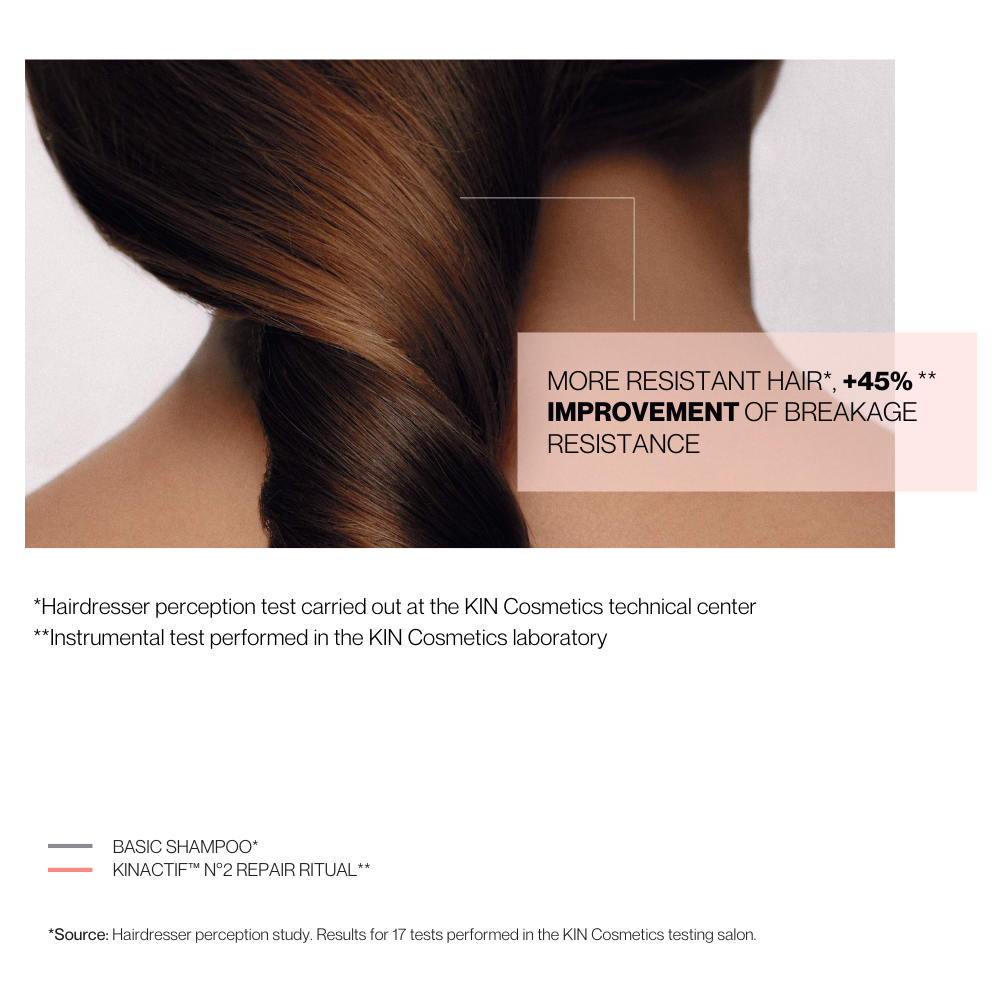 Damaged hair needs deep repair and continuous protection. KINACTIF™ N°2 REPAIR is ideal for this type of hair as it provides the strength and resistance that damaged hair needs to reco-ver, restoring the weakened hair fiber. The result is stronger, softer and shinier hair.